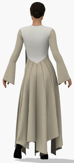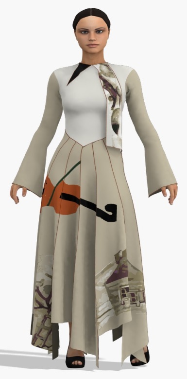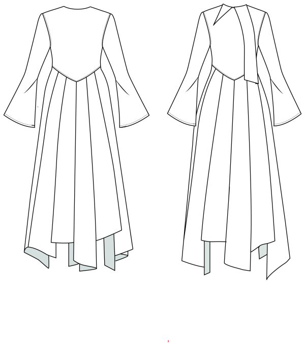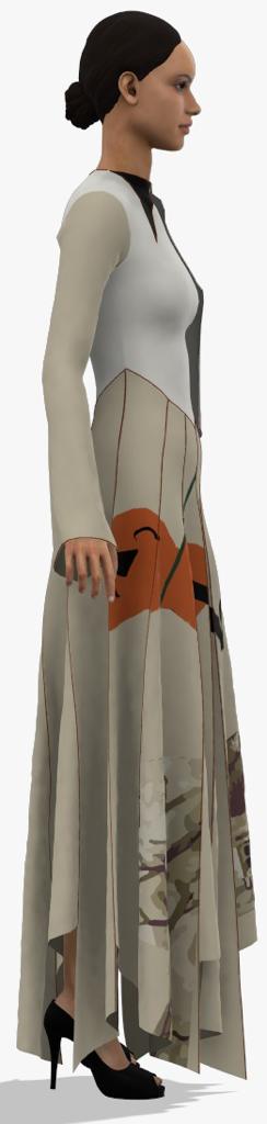 فستان بفتحه عنق دائرية ضيقة مع أضافة شرائط غير متماثلة, الجهة اليسرى طويلة تصل الي ما بعد خط الخصر, والجهة اليمني قصيرة, الكورساج محبك على الجسم, يبدا بالاتساع من خط الخصر مع وجود قصات طوليه يصل عرضها بعرض ثلث نصف الامام تقريبا تنتهى بأطوال غير مستقيمة, الاكمام متماثلة طويلة محبكة من عند خط الكوع ثم تبدا في الاتساع حتى نهاية الكم.