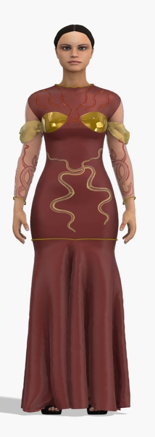 يتحقق في التصميم الاتزان والترابط بين جميع مفردات بناءة وأسلوب تنظيم الخطوط والزخارف والأشكال به ، وفي التصميم نجد تنوع في الخطوط البنائية والتي تمثلت في “الخط المائل بالأكتاف ، والخط المنحنى بحردة الرقبة وحردتي الإبط ، خطى تكسيم الوسط والجنبين ، والخط الأفقي بالقصة أسفل مستوى الجنب من الأمام والأرداف من الخلف ، الخط الرأسي بخط نصف الكم ، الخط المموج في خطوط الزخرفة المستلهمة من شكل الثعبان حيث وظفت بشكل إشعاعي بدأ من مستوى الصدر لأعلي حتى الأكتاف ، وبمنتصف الأمام بشكل متقاطع بدأ من الوسط حتى الجناب كذلك أعلى خط وسط الخلف ، وفي زخرفة الأكمام من مستوى المرفق حتى نهايتهما أعلى مستوى الرسغ ، كما وظف الخط المموج في تصميم خط ذيل الجونلة ذات الفالونات ، وقد ساعد التشكيل الفني لمسارات الخطوط على تحقيق الإيقاع الخطى الذي يكسر حدة الرتابة وينقل العين إلى المفردات التصميمية بشكل متزن ، كذلك ظهر التنوع في الأشكال ، حيث أخذ الجزء العلوي منه حتى خط الجنب شكل الساعة الزجاجية ومن ثم الشكل شبه الجرسي حتى خط الذيل ، والشكل الأسطواني بالأكمام ، هذا بالإضافة إلى أشكال الزخرفة المتمثلة في الأبليك المثبت عند الصدر على شكل عينين ، والتطريز على شكل حركة الثعبان في الأماكن السابقة الذكر، وقد ساعد التنوع في الأشكال بمساحاتها وزخرفتها على إظهار المساحة الكلية للتصميم بشكل جمالي، وقد اعتمدت الخطة اللونية للتصميم على توظيف اللون النبيتى كلون أساسي في المساحة الكلية للتصميم وبدرجة شفافة في الأكمام الشيفون وأعلى أمام وخلف الجزء العلوي من الفستان ، بالإضافة إلى اللون الذهبي في الأبليك والشريط الرفيع بالقصة أسفل الجنبين ، والأصفر في الحمالتين الشيفون، والنبيتى المحمر في التطريز على الصدر ، واللونين البيج والهافان في التطريز أسفل الصدر، وقد ظهر الملمس من خلال الأجزاء البارزة المتمثلة في الأبليك وخطوط التطريز والمسطحة المتمثلة في القماش الأساسي للفستان، هذا وقد ساعدت خصائص الانسدالية والليونة للخامة في إظهار الضبط للمفردات التصميمية على الجسم حتى مستوى الجنبين ومن ثم الاتساع حتى خط الذيل وإظهار الشفافية في الأكمام وأعلى صدر وخلف الفستان, وقد تحقق في التصميم الاتزان المتماثل بنائيا وزخرفيا، و ظهر التباين من خلال تنوع ملمس ودرجة شفافية القماش ” الساتان اللامع ، الشيفون الشفاف ، والأبليك الذهبي من الجلد الرقيق ” كذلك ما بين الحركة الساكنة لخط قصة الفستان أسفل مستوى الجنبين والحركة السريعة للأشكال المطرزة أعلاه، وقد تحقق بالتصميم السيادة في الأبليك بلونهما الذهبي وبمكان تثبيتهما كمركز جذب ينطلق منه بعض أماكن السيطرة الفرعية المتمثلة في خطوط التطريز أعلاه وأسفله ومن الجانبين بالأكمام، والإيقاع غير المنتظم الذى يشع بالطاقة والحركة المستمرة التي تأخذ العين بسرعة إلى مفردات التصميم ولا تستقر عند أماكن محددة به فمن الحركة الإشعاعية أعلى الصدر إلى التموجات في الأكمام ومنتصف الأمام إلى الاستقرار عند خط القصة الأفقية.