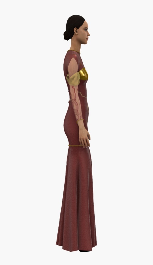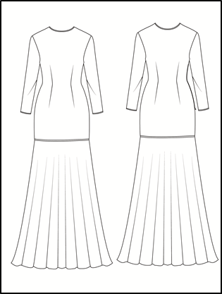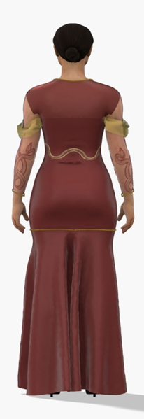 فستان بفتحة عنق دائرية، وخطي كم معتدلين، بأكمام محبكة طويلة يحتوي على إضافة درابية مثبتة به من أعلى، محبك على الجسم حتى نهاية خط الجناب مثبت به شريط ساتان بعد ذلك يبدأ في الأتساع, طويل يصل أسفل كعب القدم.