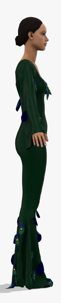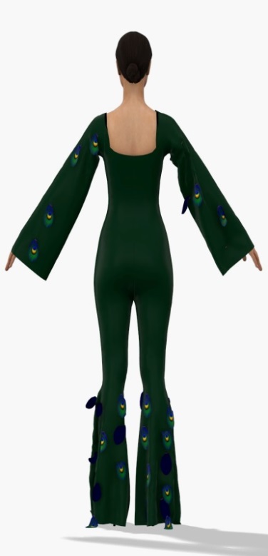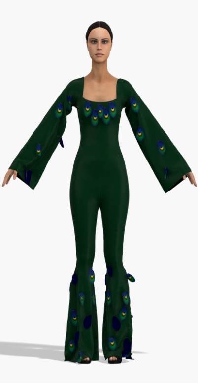 أرتبط التكوين الفني للتصميم بالتوظيف التشكيلي للفكرة التصميمية لمصدر الاقتباس المتمثل في التكوين الملمسي واللوني لريش الطاووس والذي تم إعادة صياغته فنياً بشكل مباشر مضاف بالمفردات التصميمية للسالوبيت بما يعكس السمات الفنية لمصدر الاقتباس، ويتحقق في التصميم الاتزان والترابط بين جميع مفردات بناءة وأسلوب تنظيم الخطوط والأشكال به، حيث التصميم نجد تنوع في الخطوط والتي بدورها أحدثت نوعا من الإيقاع الحركة الممزوج بالاتزان البصري ، على رغم تنوعها وذلك ما بين ” الخط المائل بخطى الكتف، والرأسي بخطي فتحة العنق من الجانبين، خط نصف الكم, الخط الأفقي بفتحة العنق أعلى مستوى الصدر مباشرة، خطي نهايتي الأكمام، قصة البنطلون أسفل مستوى الركبة مباشرة، خط ذيل البنطلون، الخط المموج في الخطين الجانبيين الخارجيين والذين يمتدين بانحناءات تتوافق مع الخط الجانبي للجسم بشكل مطابق حتى مستوى الركبة، وقد ساعد التشكيل الفني لمسارات الخطوط على تحقيق الاتساق والتجانس في التكوينات الخطية بالتصميم والمساعدة على تنقل العين بانسيابية داخل مفرداته وكسر الرتابة والملل في الرؤية الفنية كذلك ظهر التنوع في الأشكال سواء في ترتيب المساحات بالتصميم بدأ من الأكتاف إلى مستوى الركبة والتي تأخذ لشكل الظلي للجسم ، كذلك ظهر الشكل المربع في تصميم فتحة الصدر، والشكل الأسطواني في الأكمام ، والشكل الجرسي في الجزء السفلي من البنطلون بدأ من خط الركبة إلى خط الذيل وقد ساعد التنوع في الأشكال بمساحاتها المختلفة على إظهار المساحة الكلية للتصميم بشكل يبتعد عن النمطية التصميمية في توزيع المساحات التصميمية الأمر الذي يشعر المشاهد بالتنوع المتزن الذي يشعره بالراحة البصرية، وقد اعتمدت الخطة اللونية للتصميم على استخدام اللون الزيتي كلون أساسي في التصميم حيث تظهر المساحة الكلية لتصميم السالوبيت بهذا اللون ولكسر حدة اللون تم تثبيت الإضافات التصميمية المتمثلة في شكل ريش الطاووس بخطته اللونية المتوافقة مع لون الفستان والمتمثلة في كل من الألوان ” الأصفر ، الأزرق ، الأخضر ، الأزرق الداكن ” على كل من الصدر والأكمام وقصة البنطلون السفلية” في تجانس واتزان بشكل ينقل مسار العين من أعلى إلى أسفل بهدوء ، وقد تحقق في التصميم عنصر الملمس من خلال تصميم التأثير البارز لنهايات شكل ريش الطاووس المثبتة عند مستوى الصدر بشكل متجمع وعلى الأكمام وأسفل مستوى الركبة بالبنطلون بشكل متناثر والتي بدورها أعطت شكلا مجسما لها داخل المساحات التصميمية الموظفة بها، وقد ساعدت خصائص الخامة ومرونتها وإنسداليتها على الحصول على الشكل المضبوط على الجسم، وتحقيق الليونة والمرونة في الجزء السفلي من البنطلون وقد تحقق الاتزان المتماثل بنائيا وزخرفيا في التصميم حول محور رأسي يمثل خط النصف من خلال تطابق كلا الجانبين يمينه ويساره بما يحقق الراحة البصرية للعين وتحقيق الاستقرار الفني في تناول المفردات التصميمية، وتحققت السيطرة في التصميم من خلال الأماكن المثبت بها ريش الطاووس والتي تعد نقاط تركيز ينتقل إليها مسار العين في النظرة الأولى بدأ من الصدر والأكمام ونهاية البنطلون بالتصميم لتؤكد على سيادتها به من خلال التوزيع المتزن لها, أما التباين فقد تحقق من خلال تنوع المساحات ما بين الضبط المحكم حول المانيكان والأتساع في الأكمام والجزء السفلي من البنطلون وتأثير القماش السادة والأجزاء الزخرفية البارزة لريش الطاووس المضافة أعلاه، وتمثل الإيقاع المتزايد والمتناقص في توزيع ريش الطاووس وتنقله في أجزاء التصميم بشكل يحدث إيقاع حركيا من أعلى ومن أسفل ومن الجانبين بشكل يشع بالحيوية والطلاقة، وقد تحقق الوحدة والترابط بين جميع المفردات التصميمية خطيا من خلال أحكام العلاقات بين الخطوط وتنظيمها بشكل متزن، ولونيا من خلال التناغم والانسجام بين أرضية التصميم المتمثلة في اللون الزيتي والإضافات اللونية المتمثلة في المجموعة اللونية لريش الطاووس أ