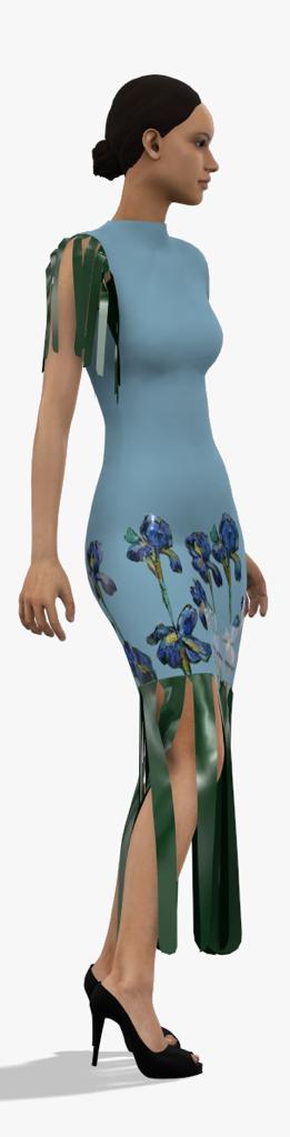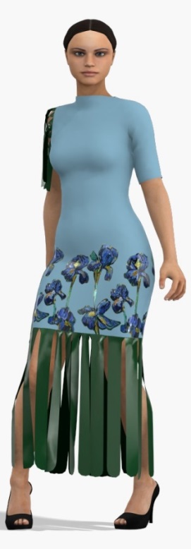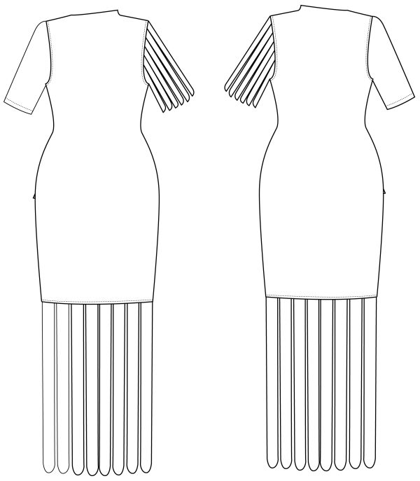عبارة عن فستان بفتحه عنق ضيقة محبك على الجسم حتى منتصف الجناب, في نهاية الفستان شرائط الأهداب طويلة تصل الي كعب القدم, الاكمام غير متماثلة في الجهة اليسرى كم محبك متوسط الطول والجهة اليمنى يحتوى الكم على شرائط الأهداب يتساوى طولها مع طول الكم الآخر.
