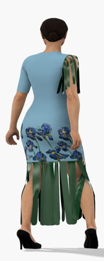 يظهر التصميم وكأنه لوحة فنية تشكيلية متنقلة تحمل بين طياتها معاني وروح الطبيعة بمناظرها الخلابة والتي تتمثل في التصميم في اللون السماوي لون السماء الصافية والزهور بألوانها وتمايل حركتها برشاقة ، واللون الأخضر في الأهداب ” الشرائط”، حيث ظهر التصميم بنائيا وزخرفيا بشكل فني مترابط ينقل الحس التشكيلي المتضمن به للعين بشكل ممتع هادئ، وقد تحقق في التصميم الترابط بين جميع مفرداته التصميمية من خطوط وألوان ومساحات وملامس، بالنسبة للخطوط ظهر الخط الأفقي بتصميم فتحة العنق ونهاية الكم وخط الذيل للفستان عند مستوى منتصف الجناب، ونهايات الأهداب المثبتة به وبنهاية الكم، والخط المائل في كلا الأكتاف، أما الخط المنحنى فانساب بنعومة ورشاقة في خطى تجسيم الوسط والجنبين من أسفل حردتي الإبط المنحنيتين ليستقر عند نهاية الخط الأفقي للذيل، وفي التصميم نجد تنوع في الخطوط والتي بدورها أحدثت نوعا من إيقاع الحركة الممزوج بالاتزان البصري، كذلك ظهر التنوع في الأشكال فأخذ الشكل الظلي للفستان شكل الساعة الزجاجية من حيث الأكتاف والجناب الشبه متساويين مع الخصر الدقيق، الشكل الأسطواني في الكم الأيمن ، المستطيل في الشكل الكلى لتنظيم وترتيب حياكة وحدات الأهداب المستطيلة الشكل بخط نهاية الكم الأيمن وخط الذيل وقد ساعد التنوع في الأشكال بمساحاتها المختلفة على إظهار المساحة الكلية للتصميم بشكل جمالي، وقد اعتمدت الخطة اللونية للتصميم على استخدام اللون اللبني في الجزء العلوي للفستان بدءا من فتحة العنق حتى منتصف الجناب ومن ثم اللون الزيتي في الأهداب، والألوان ” الأزرق ، الزيتي ، الأخضر ، الأصفر ” بمساحات مختلفة في التصميم الزخرفي المطبوع لأشكال الزهور بدءا من مستوى الجناب حتى خط الذيل ، وقد ظهر التناغم في توزيع الخطة اللونية وتناسقها وتجانسها في الجزئيين العلوي والسفلي من الفستان ، وقد تمثل الملمس الايهامي في تصميم الجزء المطبوع للزهور بتنوع أحجامها وتأثير الظلال القاتم والفاتح بها ، ملمس الأهداب الناعم المنفذة من الجلد ، وقد ساعدت خصائص الخامة ومرونتها وإنسداليتها على الحصول على الشكل المضبوط على المانيكان ، وتحقيق الانسدال الجيد للأهداب، وقد تحقق الاتزان غير المتماثل ألا إن التنظيم الأمثل للمفردات التصميمية بخطتها اللونية يشعر العين بالهدوء والاستقرار البصري للشكل الكلي، وقد تحققت السيطرة في التصميم من خلال الزهور المطبوعة بالفستان وقد تم نقل جزء من سيطرتها لتنقل إلى الأهداب بحيث تتعادل قوى السيطرة بينها وبالتالي يمكن تحقيق الرؤية الجمالية المنشودة للتصميم ككل، أما التباين فقد تحقق من خلال المساحات الفاتحة والداكن, بأجزاء التصميم البنائية والزخرفية، وأطوال الأهداب الموظفة بنهاية الكم الأيمن وخط الذيل والتي أحدثت بدورها إيقاعا حركيا من أعلى وأسفل، رغم تنظيمها بشكل تكراري منظم، وقد تحقق الوحدة بين جميع المفردات التصميمية خطيا ولونيا وملمسيا وتوزيع للخامات داخل المساحات بشكل أعطى الإحساس بالشعور الكامن بالانسجام بينها، مما خلق إحساس باكتمال علاقة الأجزاء بعضها ببعض.