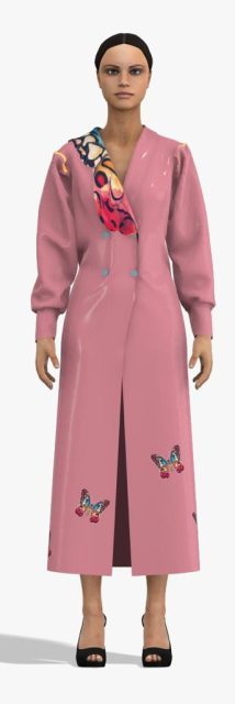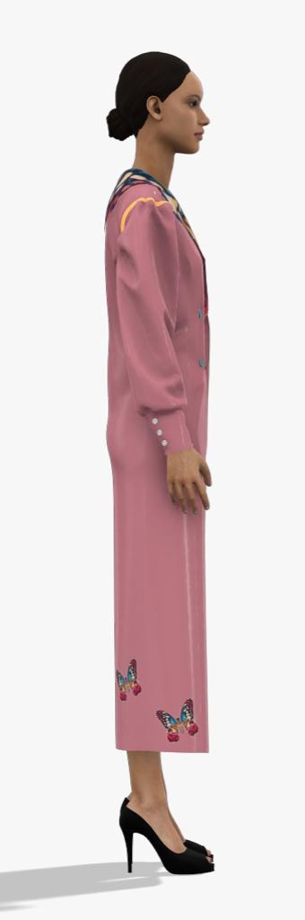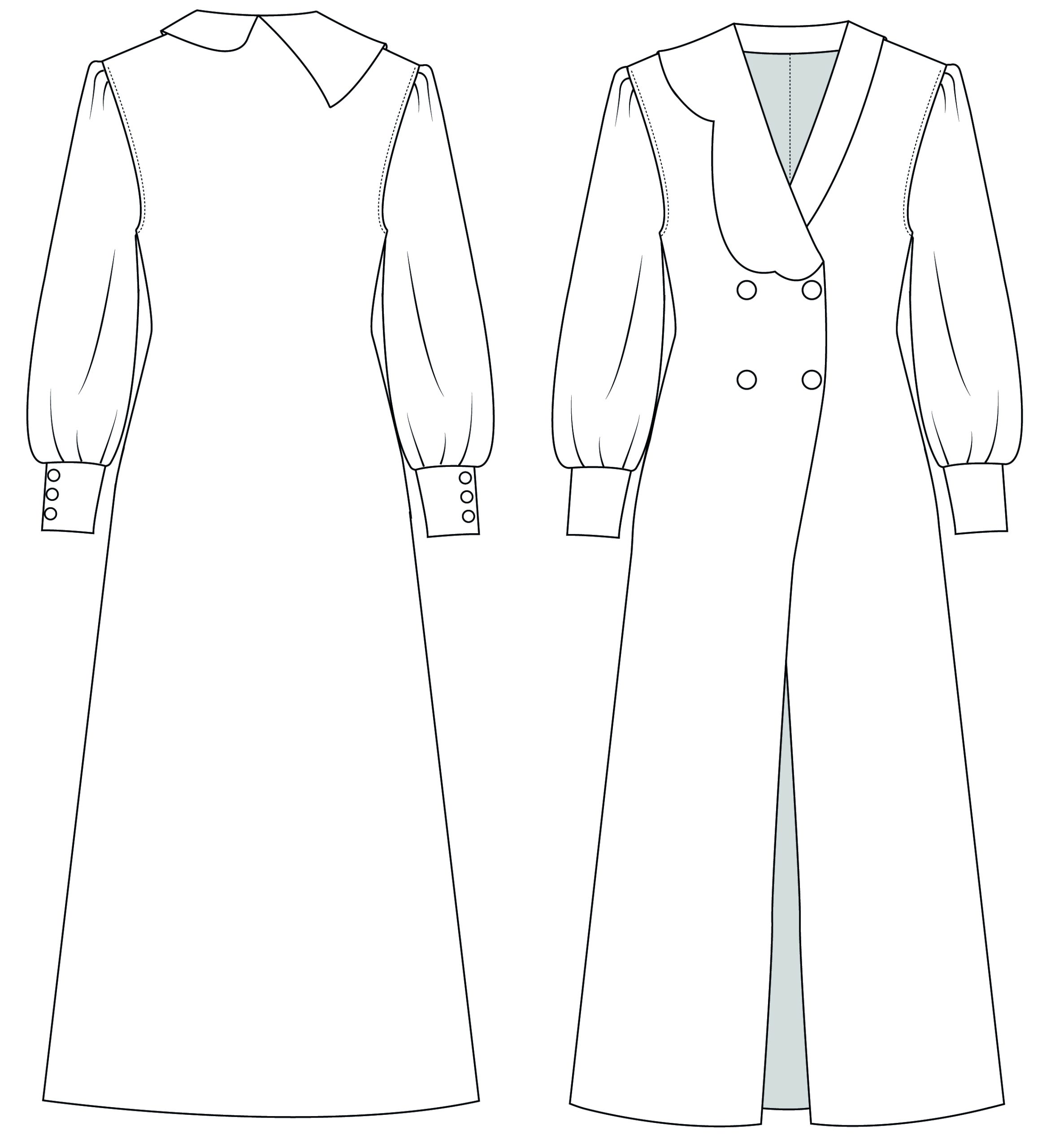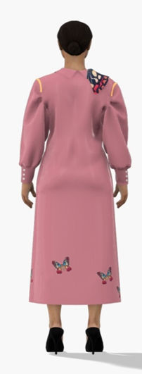 فستان غير متماثل, مفتوح بمرد كروازيه يغلق بأزرار وكولة من الجانب الأيمن على شكل جناح الفراشة, متسع قليلاً ومتوسط الطول، الأكمام طويلة متسعة, نهاية الكم أسورة عرضها يعادل تقريبا ربع طول الكم.